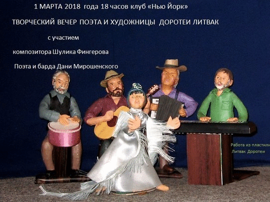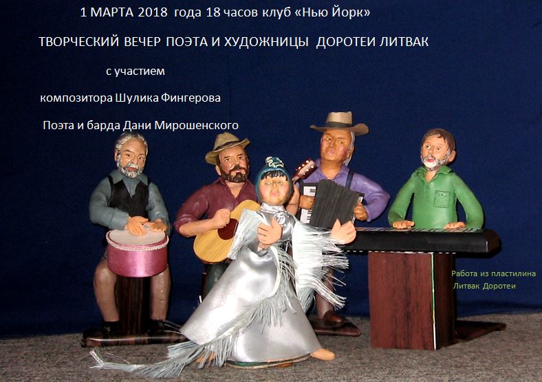 1 марта в культурном центре "Нью-Йорк" состоялся творческий вечер Доротеи Литвак, художницы и поэта, дважды призера международного конкурса карикатур, члена Союза русскоязычных писателей Израиля, финалистки национальных литературных премий "Писатель года" и "Поэт года". Она написала тексты песен к мюзиклу "Бэмби", много детских рассказов, книг, эпиграмм.